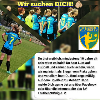 Du bist weiblich, mindestens 16 Jahre alt oder wirst es bald? Du hast Lust auf Fußball und kannst auch lächeln, wenn wir mal nicht als Sieger vom Platz gehen und vor allem hast Du Bock regelmäßig auf dem Spielfeld zu stehen? Dann melde Dich gerne bei uns über Facebook oder direkt hier über die Internetseite des SV Leuthen/Oßnig e. V.